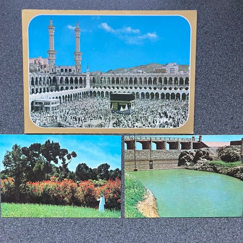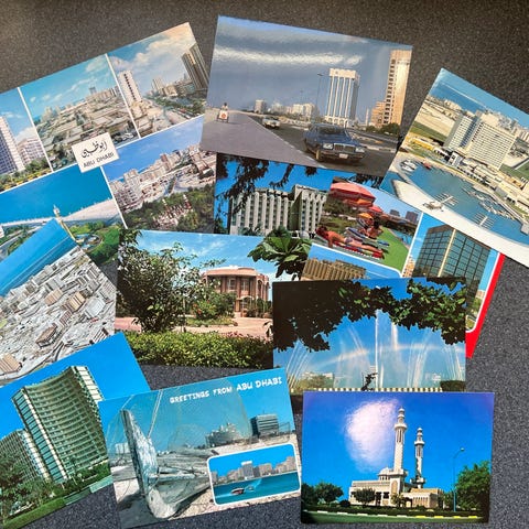 Syv gamle postkort opklæbet på masonit. Thailand. Peterspladsen. Porto Alegra. Pan Am fly. Unloading bananas. M.fl.