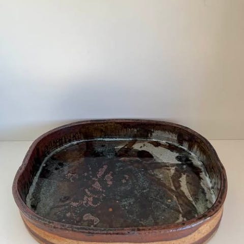 Kunstnerisk lille keramikfad, Brun keramik 13x13 med petroleum glasur