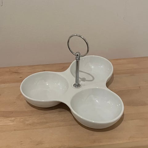 Stort smukt retro serveringsfad med to fine røde striber. Der har oprindeligt været tynde guldstreger omkring de røde, men de er med tiden næsten forsvundet. Der er ingen afslag, hak eller ridser. Længde 39,5 cm. Bredde ( midt på ) 26,5 cm. Højde 4,5 cm.