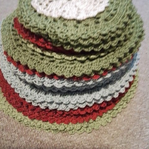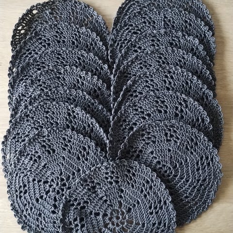 6 stk. mellemlægsservietter i mellem tykkelse, 100 % merceriseret bomuld, Ø15 cm, de trænger til en vask, derudover er de pæne. Fra et røg- og dyrefrit hjem.