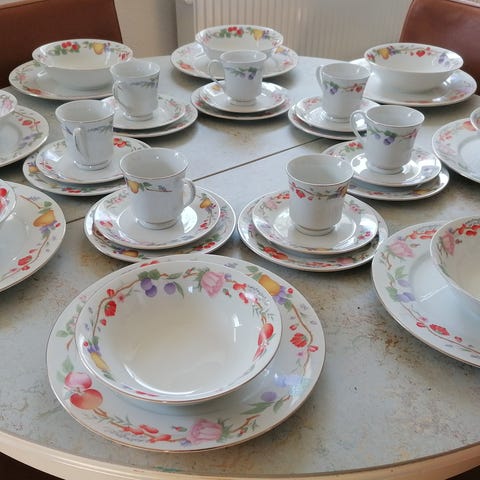 Fuldt stel inkl. kaffekopper, kagetallerkener og middagstallerkener.