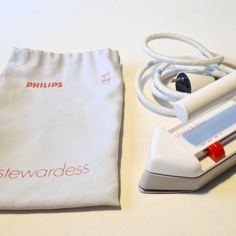 Rowenta rejsestrygejern, håndtaget kan foldes ned således det tager lidt plads. Kommer med en taske strygejernet kan ligge i. Kan stryge almindelig og med dampfunktion.