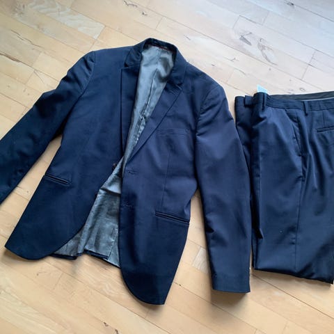 Et sort og et blåt jakkesæt. Begge jakker i str 42, og bukser i str 44. Begge skjorter XXS/str 34. Pris pr. sæt, dvs. jakke+bukser+skjorte.