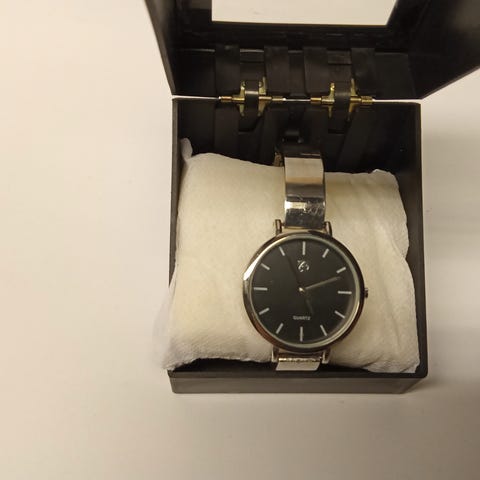 Sølv farver, Stainless steel, pæn og velholdt samt glasset er pæn, virker som det skal, Læder brun rem, diameter 21mm. Med kronen, mellem hornene 9mm.SWISS MADE.sender via postnord