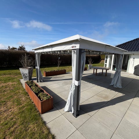 Tag, gardiner og myggenet til havepavillon Havemøbelland.