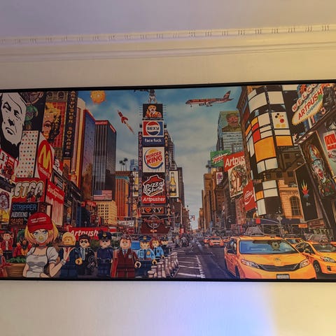 Oliemaleri: Obama Dollar, kunstneren har håndtrykt sedlen med Irakisk olie fra Basra og derefter malet Obama på. Politisk statement. Hver Dollar er unik og signeret. Galleri pris per styk kr. 15.000,- men her kan du få begge for kr. 9.000,- eventuel bytte med anden moderne kunst. Mål: 110x50 cm. Værkerne hedder "Smoke" og "Fits perfectly".