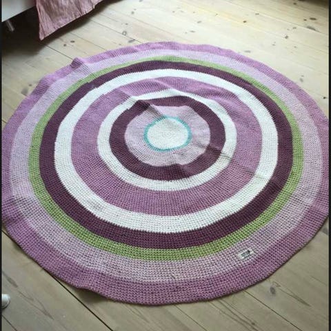 Fint hæklet og stribet gulvtæppe fra Sebra i de fineste farver. Fx til børneværelset.
