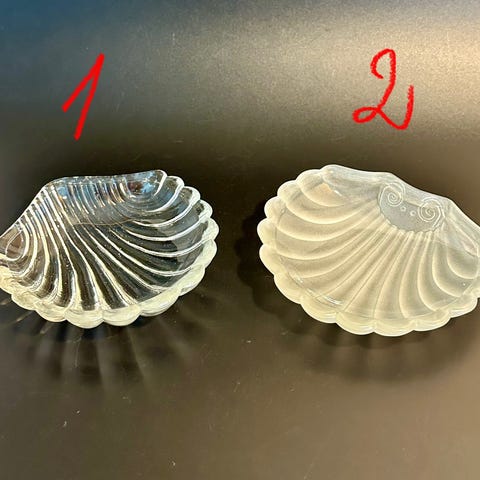 Fin lille muslingeformet skål i sort glas (porcelæn?). Dia ca 14 cm.