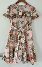 Mønstret minikjole med korte ærmer og en udsvinget nederdel. Kjolen har et aftageligt bindebælte i taljen.