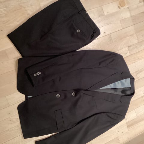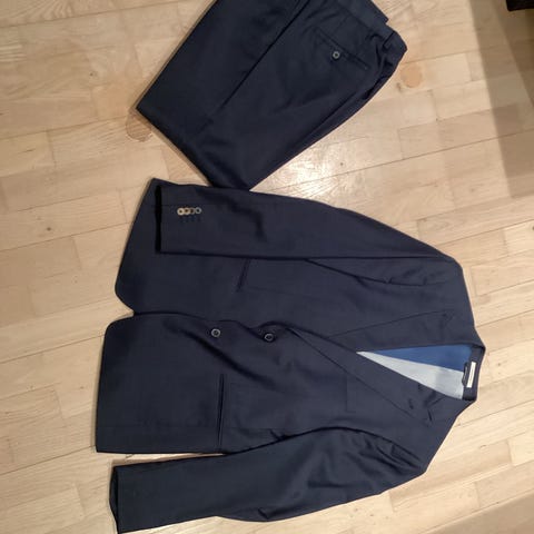 Van Gils: Smukt, mørkeblåt jakkesæt i str 52/50, kun brugt 2 gange, pletfrit og klar til fest. Lidt mørkere end tæt på billedet viser. Ny pris 4.995,-