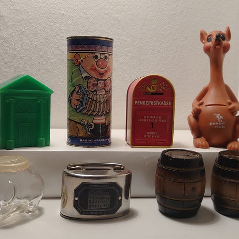 To drejede sparebøsser – tøndeformede, ca. midt 1900-tallet