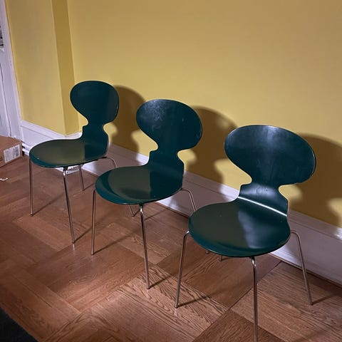 Spisebordsstol, Arne Jacobsen “Myren”, 5 brugte Arne Jacobsen Myren stole i mørkeblå.