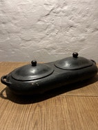 Udskåret æske i træ med to rum - begge med låg - til opbevaring af mad? Formentlig afrikansk.