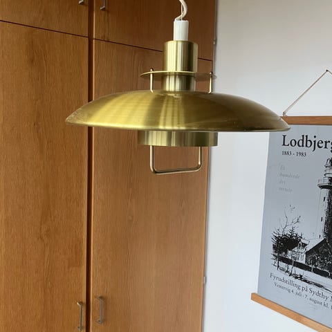 Retro Lampe - Metal Pendel - Guld. Skærm i messingarmen metal samt gitter.