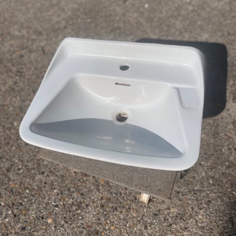 IFÔ vask i hvid porcelæn med hul til armatur og overløb. Vasken har et ovalt kar og fladt område til sæbe eller lignende. Den er egnet til montering på væg og har beslag til fastgørelse.