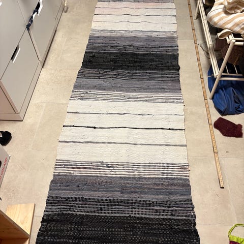 Svensk vintage kludetæppe som måtte. Lange, hvide frynser i enderne.