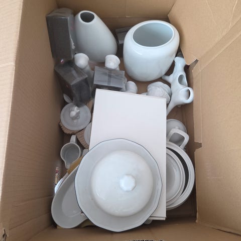 Der er én Ikea skål med riller, tre rillede Ikea kopper i to størrelser, én kop fra Pillivuyt, fire små firkantede skåle, to hjerteskåle, én varmebriks med porcelæn i midten, syv kvadratiske fliser, og et sæt juletræspynt med lædersnore. Der kan blive til mange gaver til familien... Sælges samlet for: