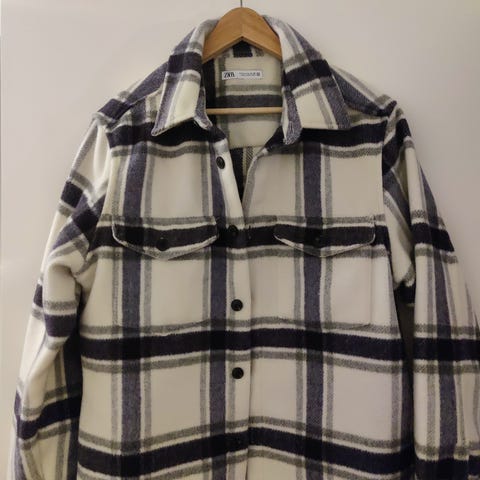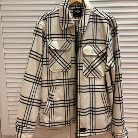 Flot ternet jakke fra ZARA. Størrelse 46. Brugt et par gange. Spids revers med dobbelt slids. Småternet med en smal pasform. Ærmer er ikke lagt op så den passer til en der 170-175 høj.