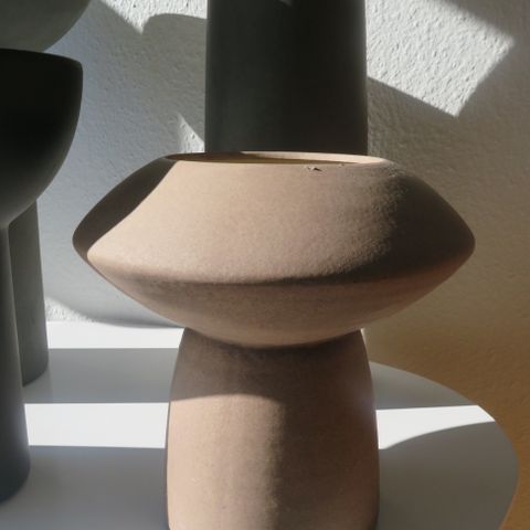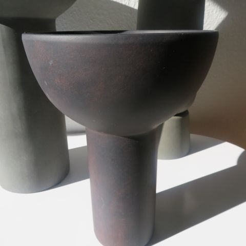 NY Moderne meget høj vase, rund, mørk grå, dekorationsfad, lysfad, vase, mærke 101cph. Pris: 150,-kr.