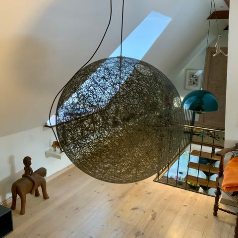 Moijn loftlamper håndlavet i DK (produceres ikke længere). Hvid pvc med tværpinde i træ og sort stofledning. 2 stk.