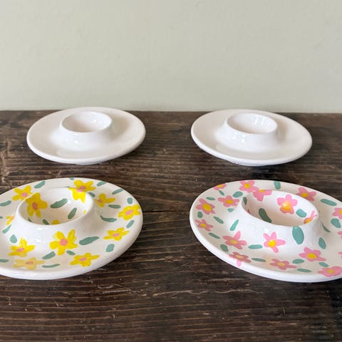 Æggebægre, M P, 10 æggebægre, 8 grønne og 2 hvide. Købt på Kunsthåndværkermarkedet på Frue Plads. Alle uden skår. Jeg kan desværre ikke huske keramikerens navn, men de havde værksted først på Vesterbrogade. 45 kr. stykket og selvfølgelig rabat ved køb af flere.