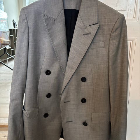 Smuk blazer i 100 % uld. Har fin detalje ved lukning i slids bag på hvor der er 3 skjulte knapper som kan lukkes og åbnes. Købt i butikken i Store Strandstræde i Kbh K.