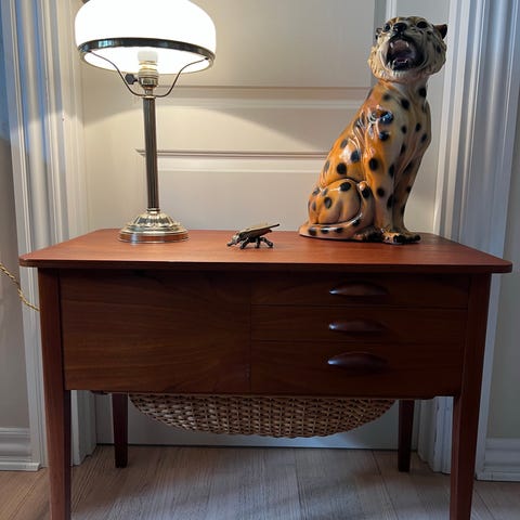 Sybord teaktræ, skab monteret på stel med hjul, indeholder, 1 skuffe, med rum, 1 udtræks hylde med flet kurv til garn eller strikketøj