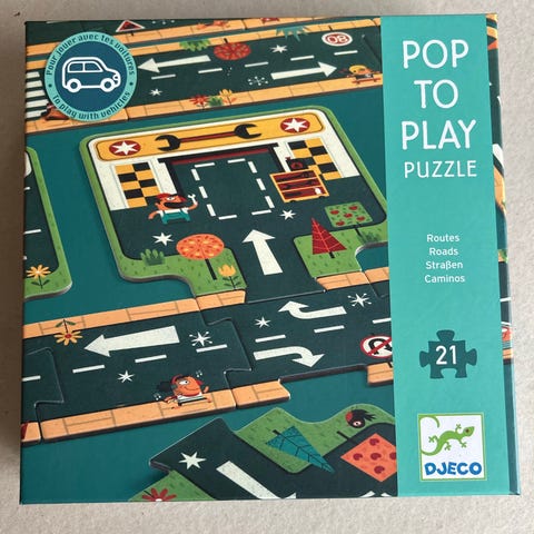 Djeco Pop To Play puslespil med 24 brikker. Puslespillet indeholder elementer som vejskilte og trafiklys, der kan bruges til at skabe en byscene. Egnet til børn fra 3 år og op. Materiale og farver er tilpasset børns brug og læring.