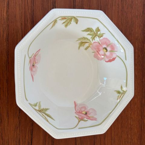 Hvidt 8 kantet stentøjs stel, som både tåler opvaskemaskinen og micro ovn.