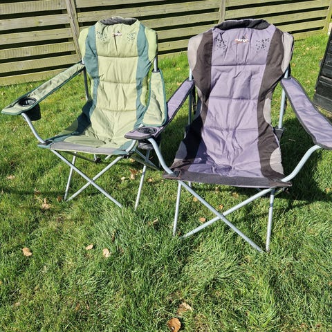 Kraftige holdbare stole i rigtig fin stand. Der er en lomme bagpå, og stolene kan lægges ned til hvilestole. Kan foldes sammen og opbevares i poser