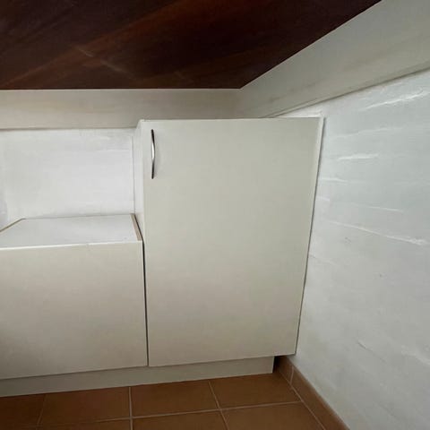 Meget stærk og stabil. Min ven, som laver møbler, har lavet den til mig. Den er grå i farven. Der er én defekt – jeg stod på den (100 kg), og det fik en af siderne øverst til at revne en smule. Det er dog ikke meget, og det kan ses, men jeg har stadig haft et akvarium ovenpå, og det holder fint. :D På siden er der små skabe med låger. 1. og 2. hylde kan tages ud, så du kan have f.eks. en printer eller en ovn der.