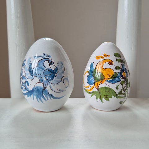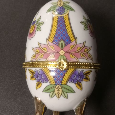 Keramik æg, med tre gyldne fødder og hængsel, Vintak, fra 80èrne, smykkeskrin i ægge stil, utrolig smukke med blomster motiv.