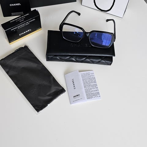 CHANEL solbrille med Chanel dobbelt c-logo i perlemor med matchende solidt brille-etui i elfenben. Brillen er anvendt dvs med bitte små spor i brilleglas fortil hvis man holder dem i en bestemt retning. Man syner ikke noget når de bæres/frit fremsyn.