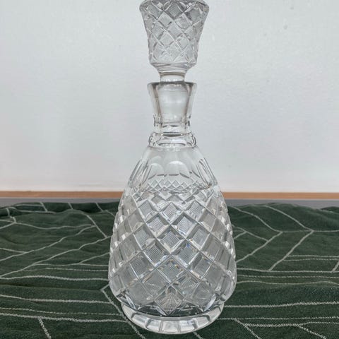 En krystalkaraffel aldrig brugt. Har bare samlet støv. Højde 22 cm. Med proppen.
