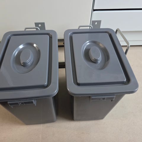 Utrusta skraldestativ til montering i bunden af et skab. Tilsyneladende udgået. Har stået i skur og er blevet skyllet af for støv men trænger til lidt skurecreme i bunden. Bund i plast, stativ i metal.