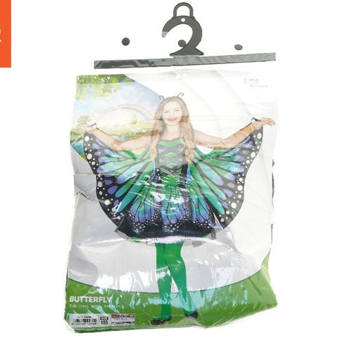 Prinsesse-påfuglskostume med tylskørt og tilhørende vinger/kappe der påmonteres med velcro. Vingerne har elastik til håndledene.