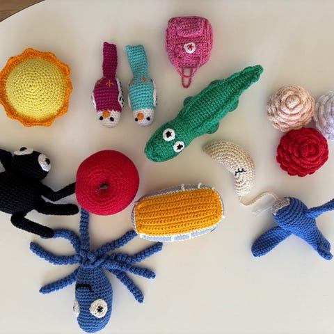 Sød, hæklet mascot til pige med solskygge og håndbold.