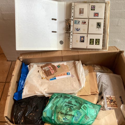 OVER 2 FLYTTEKASSER PROPPET MED FRIMÆRKER I ALBUM, KASSER OG POSER M.M.