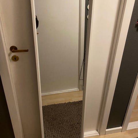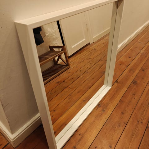 Gulvspejl hvid Knapper IKEA. Dette spejl skjuler noget. Bag spejlet er der kroge og en stang. Det er praktisk, hvis du vil hænge tøjet til i morgen op og sove lidt længere.