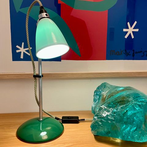 Hector Dome bordlampe. Tofarvet speciel og nu udgået model med mørkegrøn porcelænsfod. Der er en lille næsten usynlig revne på foden.