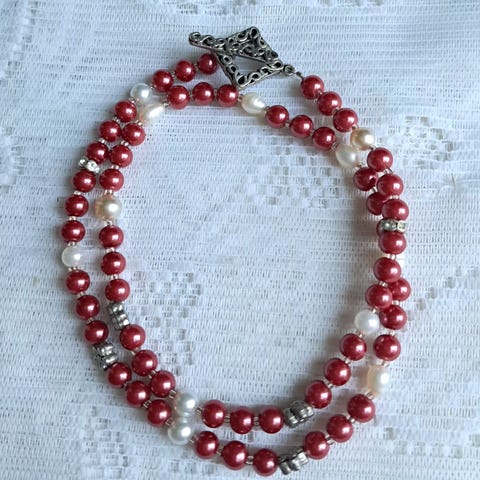 Halskæde, bestående af klare glasperler med vedhæng der symboliserer