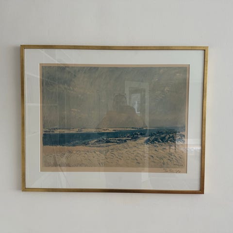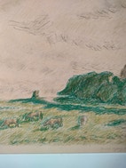 Litografi af Ernst Syberg (1906-1981). Sommerland skab med græssende køer og kirke i baggrunden. 1977.