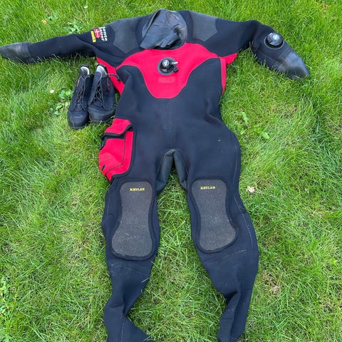 Trilaminat tørdragt sælges, da jeg er stoppet med at dykke. Der er ingen størrelsesangivelse på dragten, men jeg er 180 cm. høj og bruger str. 42 i sko. Dragten giver mig masser af plads til inderdragt mv. Støvlerne er formentlig store nok til en str. 44.