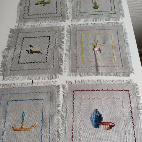 6 broderede servietter af stof. Kan også bruges som dækkeservietter. Hver serviet har forskellig blomst.