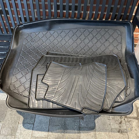Bagerumsdeler til Skodas skinnesystem. Holdere til siderne og 2 ubrugte gulvmåtter ved bagsæde