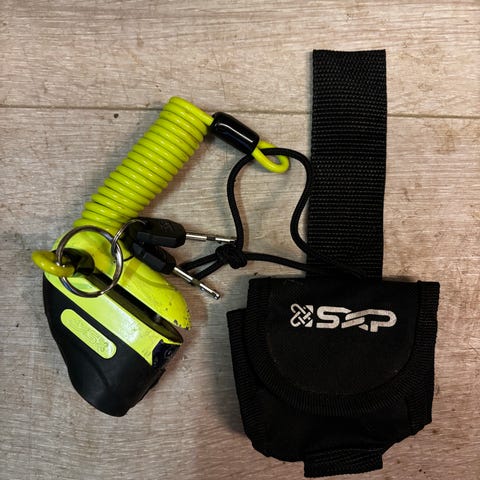 Skivebremselås med alarm, Skivebremselås med elektronisk alarm som hyler hvis den bevæges. Inkl. 2 nøgler.