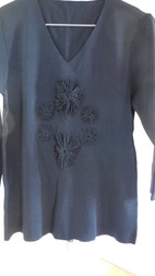 Bluse, andet mrk., str. 36, Sort, 56% nylon 44% viscose, Næsten som ny, Str. 36-38 - sort bluse med v-udskæring, 3/4 lange ærmer, rosetter/blomster på forsiden og 1 roset/blomst på det ene ærme. Brystmål ca. 84 cm. Efterårsbluse. Fra røgfrit hjem. Se også mine andre annoncer. Kan sendes med gls. Køber betaler porto. Skriv på annoncen.(Cam) (Hvid-ks)(20)