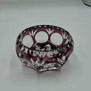 2 - to mundblæste små ubrugte skåle i flot stand. Klar glas med lilla striber. Smukt håndværk. Mål - H 7,5 cm, D 10 cm.
