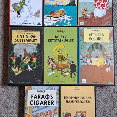 Seks fine VHS bånd med Tintin eventyr. Lige til sommerhusets gamle afspiller :-)