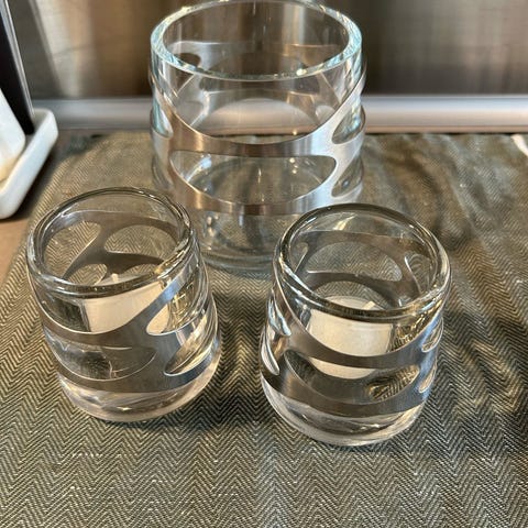 Glas, Lysestager/vaser, Stelton, 2 store vaser/lysestage, Stelton Embrace medpoletet stålbælte omkring. Højde 10 cm, diameter 7,5 cm.